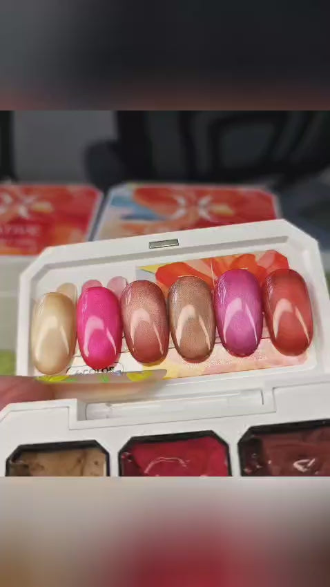 Each of the six rich translucent shades — bronze, rose gold, deep plum, molten copper, ruby red, and smoky chocolate — bursts with multidimensional metallic pigment and silky cat eye shimmer. Simply use a magnet to sculpt shifting light and movement across each nail for breathtaking cat-eye, chrome, or ombré effects.